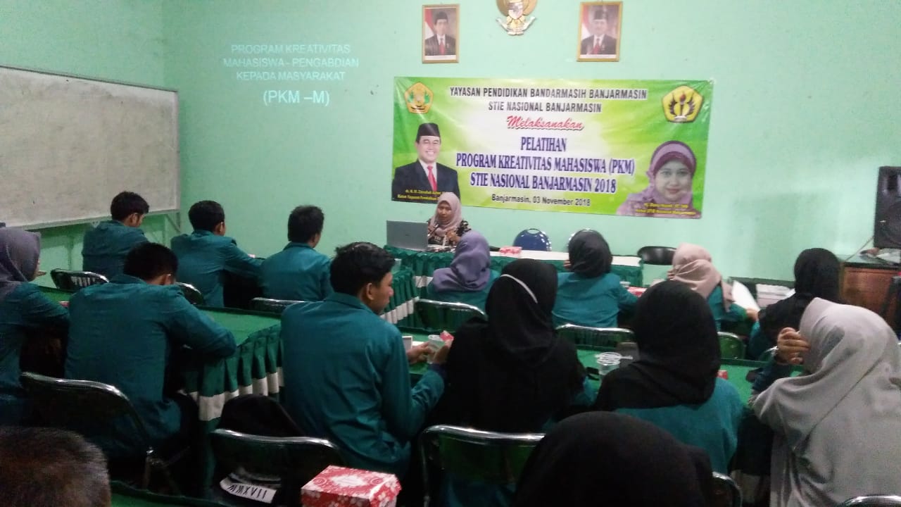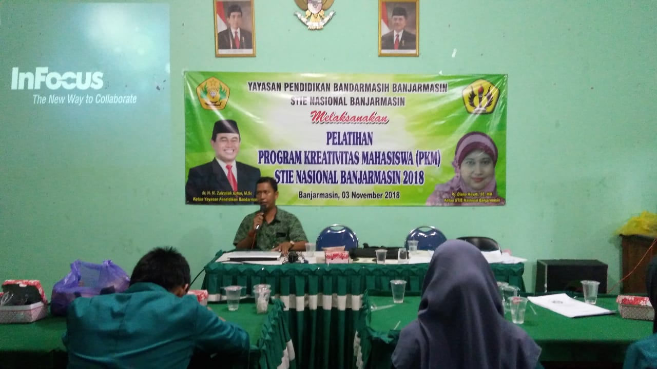 Pelaksanaan Pelatihan Program Kreativitas Mahasiswa (PKM) STIE Nasional Banjarmasin hari Sabtu 03 Nov 2018 bertempat di Aula STIE Nasional Banjarmasin, pelatihan PKM dibuka langsung oleh Ketua Yayasan Pendidikan Bandarmasih Banjarmasin Bapak dr. H. M. Zairullah Azhar, M.Sc yang dihadiri oleh pengurus yayasan, Ketua STIE Nasional Banjarmasin, Dosen Prodi Akuntansi dan Manajemen.