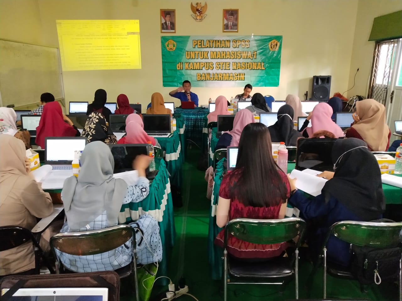 Pelatihan SPSS diselenggarakan bagi mahasiswa dan mahasiswi STIE Nasional untuk menambah pengetahuan bagi mereka yg berada di semester akhir dan akan memprogram skripsi, tujuannya agar mahasiswa dapat menguasi teknik analisa data dengan metode kuantitatif dan lebih memperluas materi skripsi yang akan diangkat mahasiswa, tidak monoton.Pelatihan ini diikuti oleh 70 orang mahasiswa, materi diberikan oleh dosen - dosen STIE Nasional yang menguasai bidangnya.