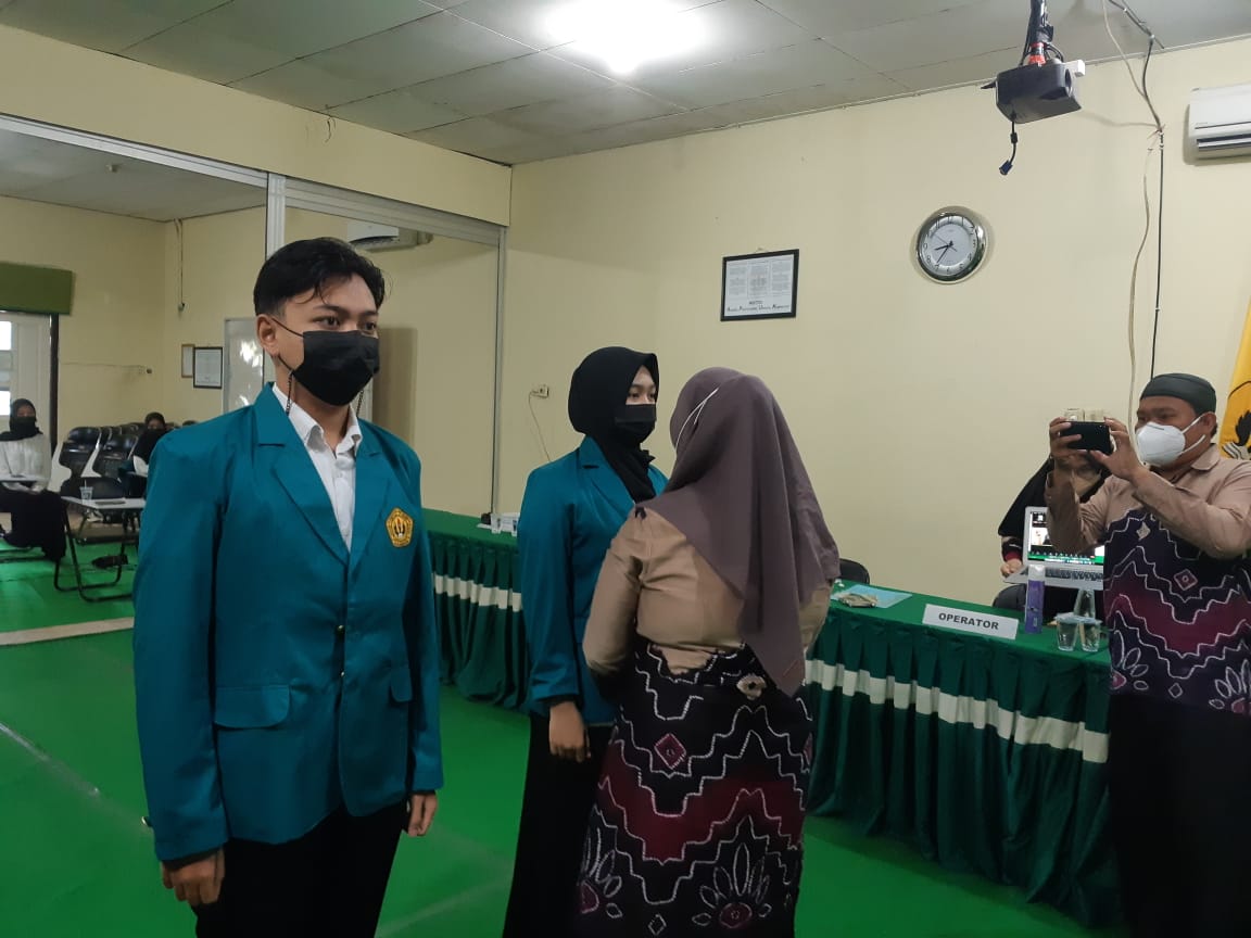 photo pemasangan jaket almamater yang diwakili oleh 2 mahasiswa dari 10 mahasiswa yang hadir di Aula