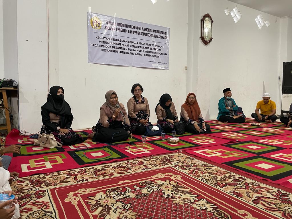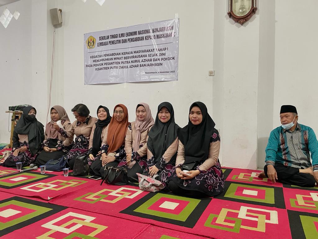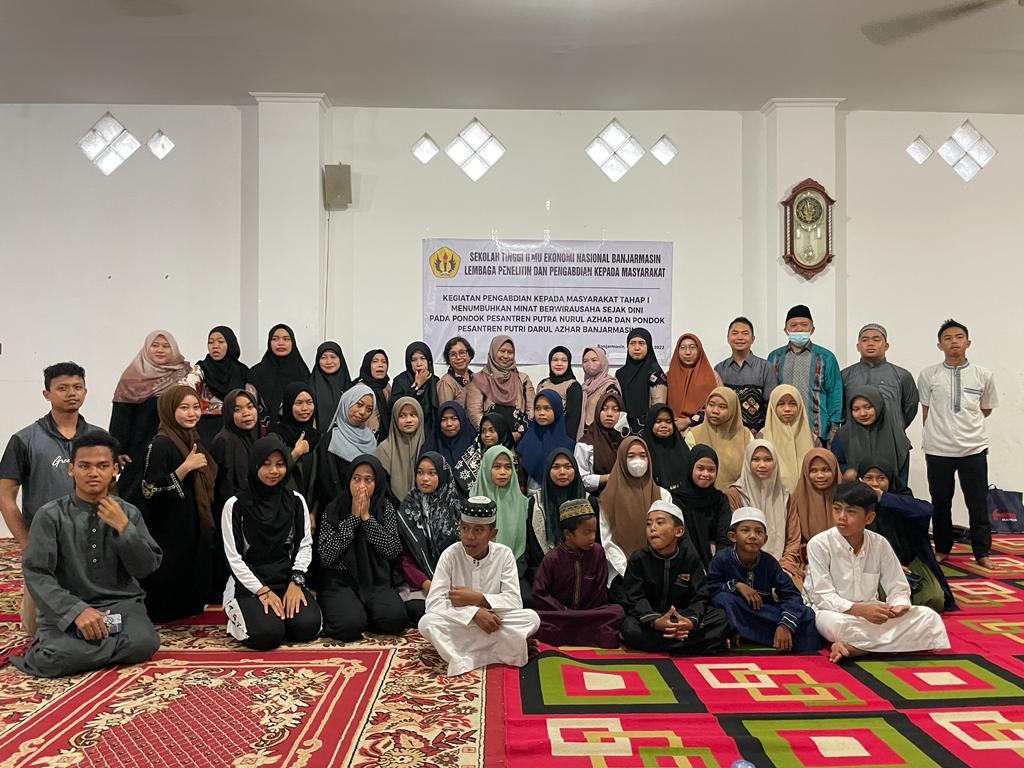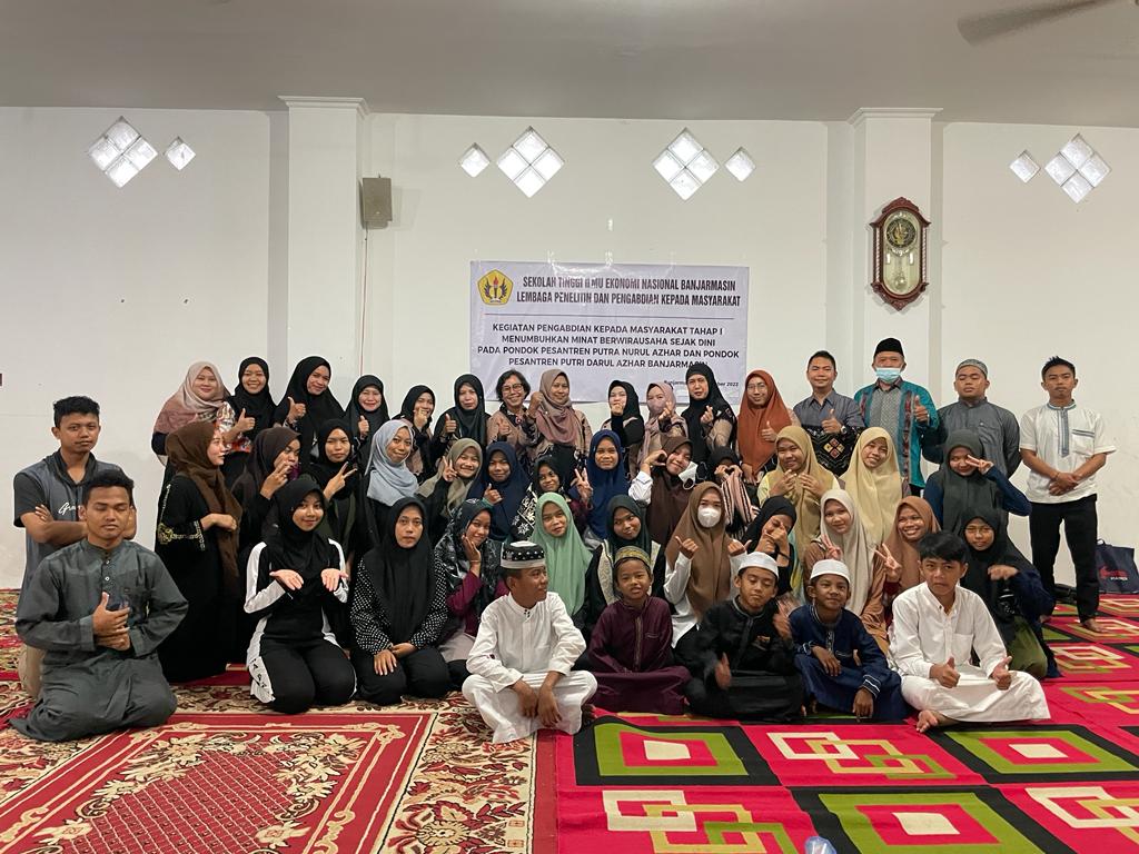 STIE Nasional Banjarmasin mengadakan kegiatan pengabdian pada masyarakat bertujuan untuk meningkatkan ilmu pengetahuan dalam halnya menanamkan jiwa kreativitas dan kewirausahaan sejak dini yang dilaksanakan di Pondok Pesantren Putra Nurul Azhar dan Pondok Pesantren Putri Darul Azhar Banjarmasin pada Jum'at 04 November 2022.